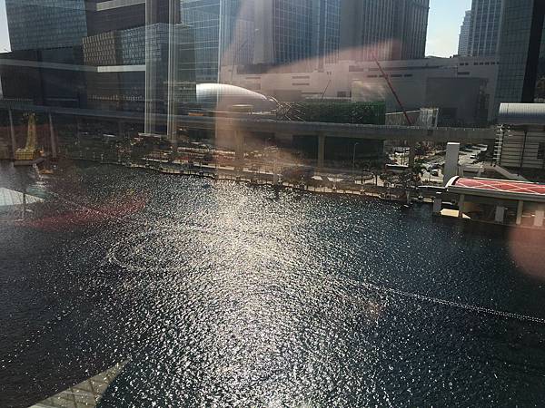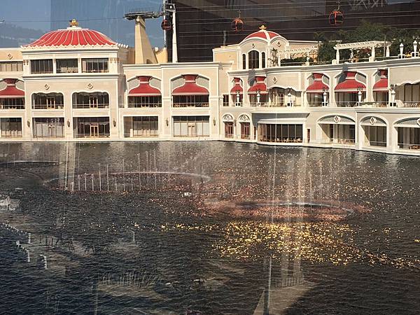 「好大的湖泊耶。」整個纜車是圍繞表演湖轉,最舒服的就是在上面可以看免費的噴水表演啦。