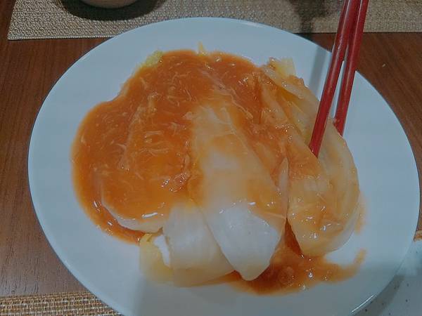 「蟹粉扒津白,好特別名字的感覺。」白菜淋上螃蟹燴煮的醬汁。