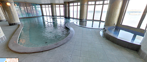以男性來說,共有3大池映入眼簾,而其實還有一池藏在大池中,分別代表不同溫度,效果也有差異,最左邊最大的是「中溫溫泉」,溫度約在40度,把「高溫溫泉」包裹在內,中溫有稀釋,而高溫就是直接把1500公尺深的溫泉汲取上來,溫度約在42度,中間的池子為碳酸泉,可以將肌膚活性化,而右邊的冷水浴池則幫助降溫;其實在中溫溫泉旁邊的大牆上有教你各部位最好放鬆的方法喔,而配上夕陽西下,染到橘紅的窗外美景,真的很享受。(圖取自官網)