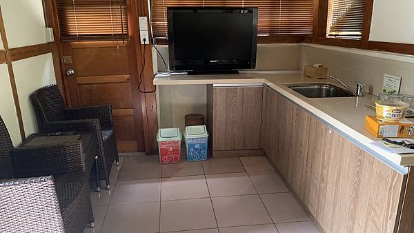 進來的地方擺了椅子、電視和小流理台,如果怕晚上在山上肚子餓,是有空間泡個泡麵的(不過要拿熱水的的地方在外頭就是)。