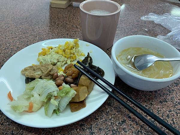 快轉到早餐時間啦,早餐一樣採自助式夾取,當然也一樣不用太過期待。右邊的麻油麵線則是讓人比較驚豔。