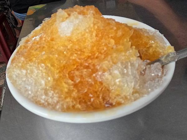 很快地被冰覆蓋的就上桌啦。會有這麼多冰是因為綠豆和糖水本身是溫的,這樣綜合起來算是剛剛好。綠豆蒜就是綠豆中間的仁,配上粉條讓整碗的口感更有層次,對運動量大的單車旅人來說,同樣是很適合的點心。雖然是中午時分的12:23,但被煩惱填滿的狀況來,來碗冰也很讚。