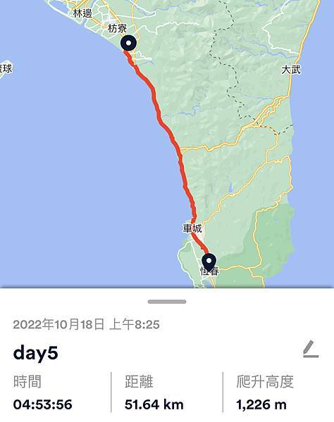看一下今天悽慘的成績單吧,總里程數是51.6公里,爬升高度是1226公尺,很可惜路程雖然不硬,卻有一大半是因為風,被迫牽行甚至無法繼續挺進,不只還停在屏東,甚至連「往北」都還沒出現,讓這個路程最短的一天是開心不起來,就當今天是旅途中的休息日,讓身體好好放鬆一下,希望明天不要再出現,這個媲美中度颱風的強風,順利前進啦。