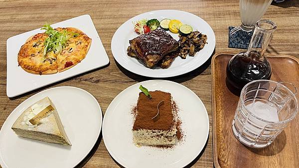 費用:BBQ經典烤豬肋排580元、蘑菇燻雞脆皮披薩260元、義式提拉米蘇240元、日式焙茶千層240元、冰釀咖啡300元