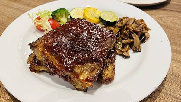 先上桌的是「BBQ經典烤豬肋排」。老實說這個分量真的有點嚇到,因為總共有是2大塊,豬肉口感厚實但不柴,外面刷上酸酸甜甜的醬,吃起來很開胃。豬肋排中間還有一點軟骨,脆脆控會愛。櫛瓜不會太爛還保有水分,在吃豬肋排間可以穿插,轉換一下味蕾。