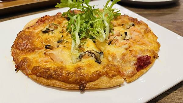 蘑菇燻雞脆皮披薩走薄皮路線,並以蕃茄醬為基底,最後面餅皮咬下,竟會發出「卡茲卡茲」聲音,相當過癮。不過酥脆並未搶走整體風采,口感微酸且開胃,料多、起司也多,即使看起來小小一份,整體還是相當有飽足感。