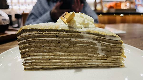 今天我們嘗試的另一款甜點,同樣是偏大人味的「日式焙茶千層」。焙茶是近年也很夯的甜點,咬下後約2秒,焙茶香味便從內層竄出,不甜但是好幸福。幾年前吃過裡面很乾的千層蛋糕,一度對這類蛋糕有點陰影,幸好這邊的蛋糕相當濕潤。最後留在嘴巴的,只有滿滿的焙茶香,不過不會苦,很加分。