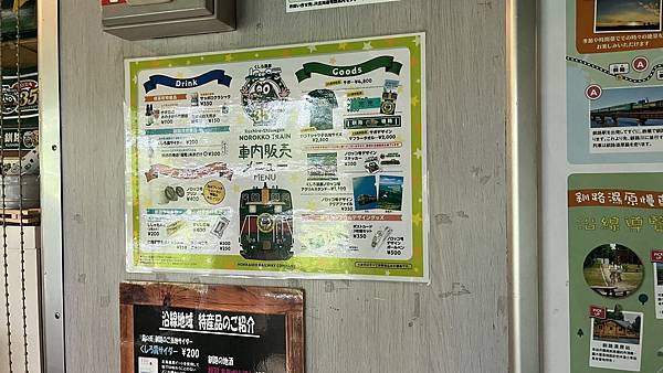 至於車內的商品販售處,則是在第2車廂的尾巴,商品有衣服、圍巾、資料夾等,食物部分則有酒、汽水和布丁等。