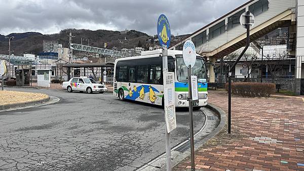 來到諏訪湖畔,一定要到高處往下俯瞰,才符合電影內的場景,因此可以搭乘11:48的「かりんちゃんバス」,往能眺望諏訪湖的立石公園前進。