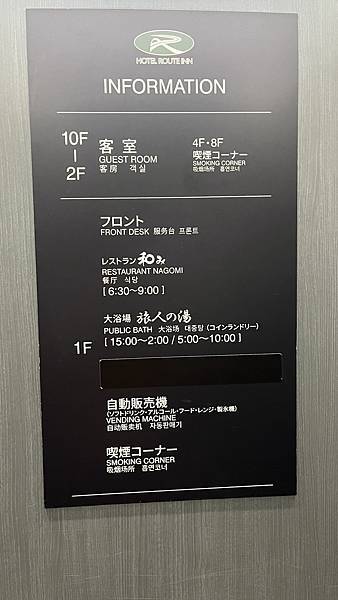 快速辦好C/I手續後,來看一下飯店的分布,基本上包括大廳、餐廳、自動販賣機和大浴場都在1樓,2樓以上就都是房間了。